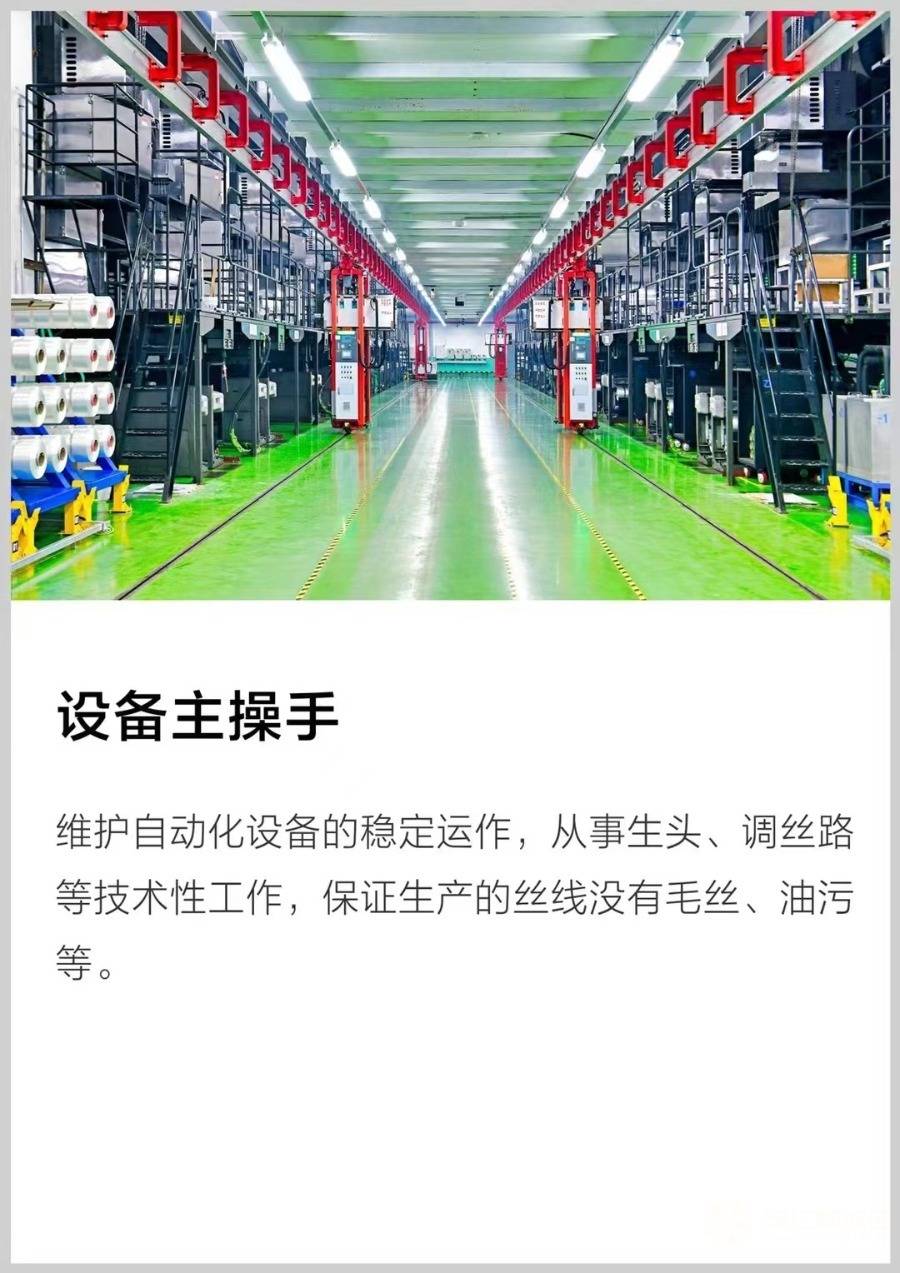 招聘岗位:长丝、加弹、聚酯操作工、设备机修工、电气维护员、工艺巡检员、水处理工艺员、叉车工、化验分析员、包装工,投料工、仓库统计员等十多个岗位,特殊岗位需要持证上岗。